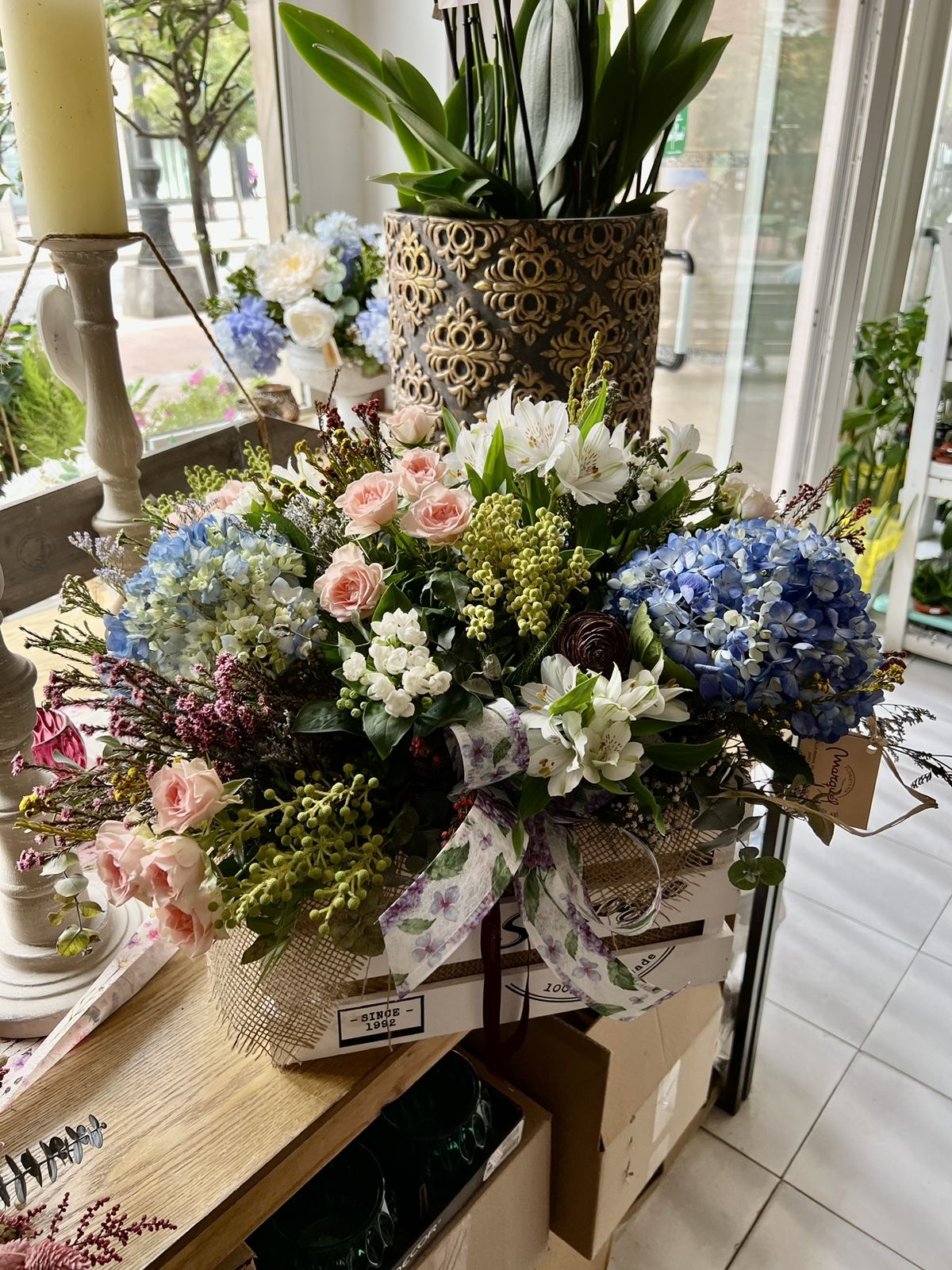 Caja con hortensias azules