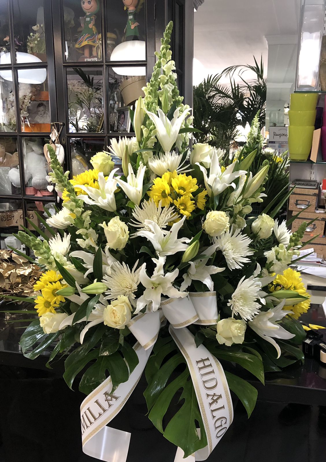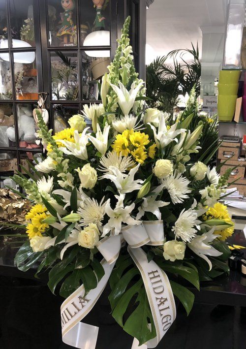 Centro mortuorio en tonos blancos y amarillos